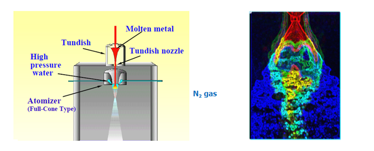 霧化器結(jié)構(gòu)如圖所示,采用此結(jié)構(gòu)設(shè)計有如下好處:單一霧化器中實現(xiàn)二步霧化,先是氣體打擊霧化,后是超高壓水打擊水霧化;第一步氣體預(yù)破碎并冷卻鋼液,使鋼液液流形成液波及破裂鋼帶,第二步充分利用超高壓水的動能,進(jìn)一步打擊液流及破裂鋼帶,使之變形和細(xì)化成為細(xì)小的顆粒粉末;采用該霧化器制備的粉末為近似球形,兼?zhèn)錃忪F化的優(yōu)異性能,同時細(xì)粉產(chǎn)出率高。
